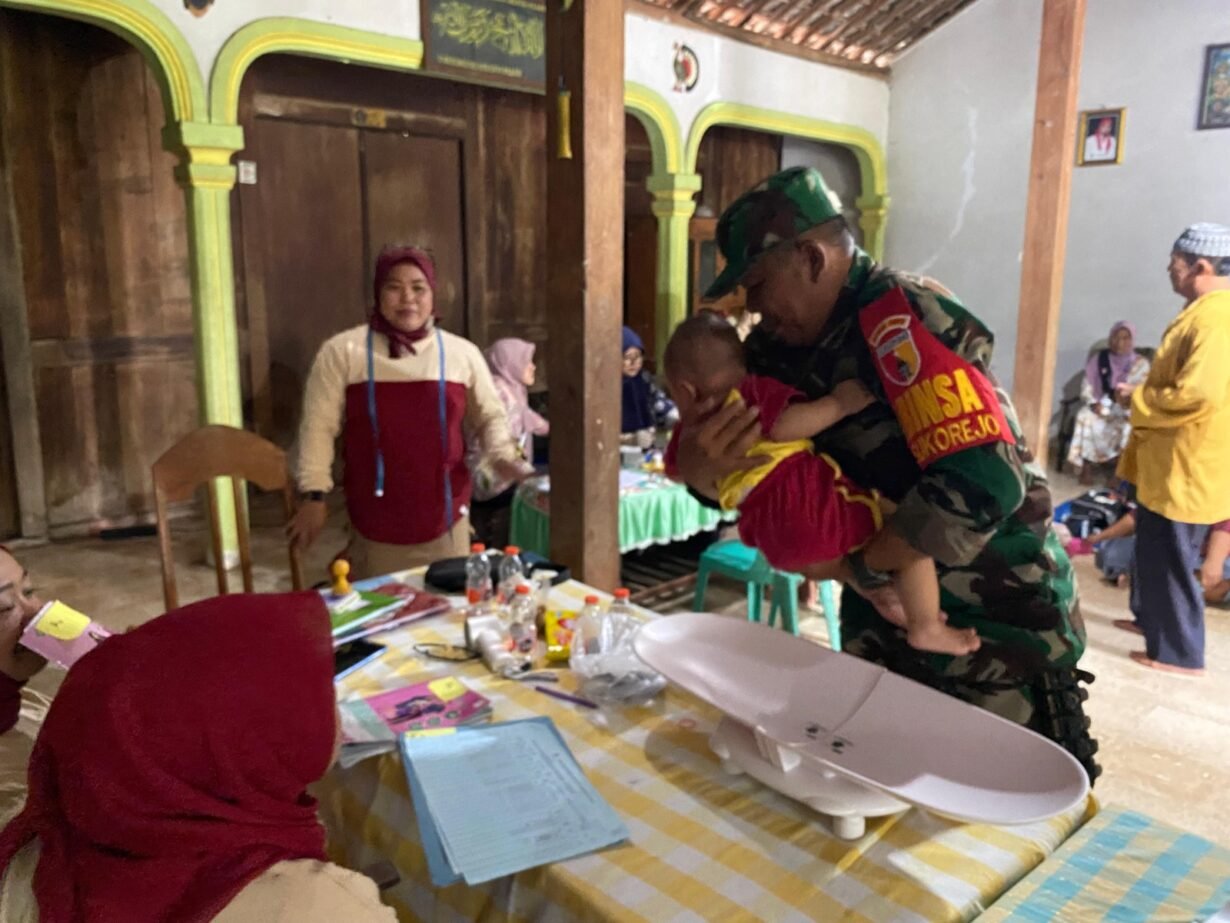 Babinsa Kelurahan Sukorejo Koramil 0808/09 Sutojayan Sertu Hafid Mulyadi, turut aktif mendampingi kegiatan Posyandu yang berlangsung di Jalan Arjuna RT. 03 RW. 02 Kegiatan ini meliputi pemberian vitamin tetes kepada balita, penimbangan berat badan, serta pengukuran tinggi badan sebagai bagian dari pemantauan tumbuh kembang anak.
