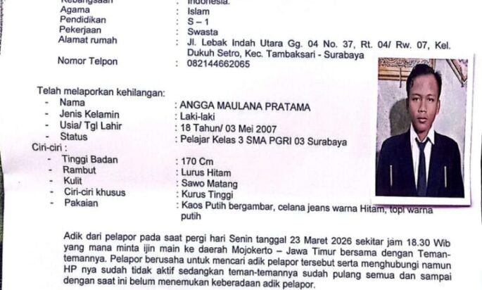 Surabaya. Jelajahpenanews. Com – semenjak pamit pergi bermain ke Pacet, Mojokerto, Jawa Timur. remaja bernama Angga Maulana Pratama (18) warga Lebak Indah Utara 4/37 Surabaya sampai saat ini belum ada kabar (belum di temukan) dalam keberadaanya.